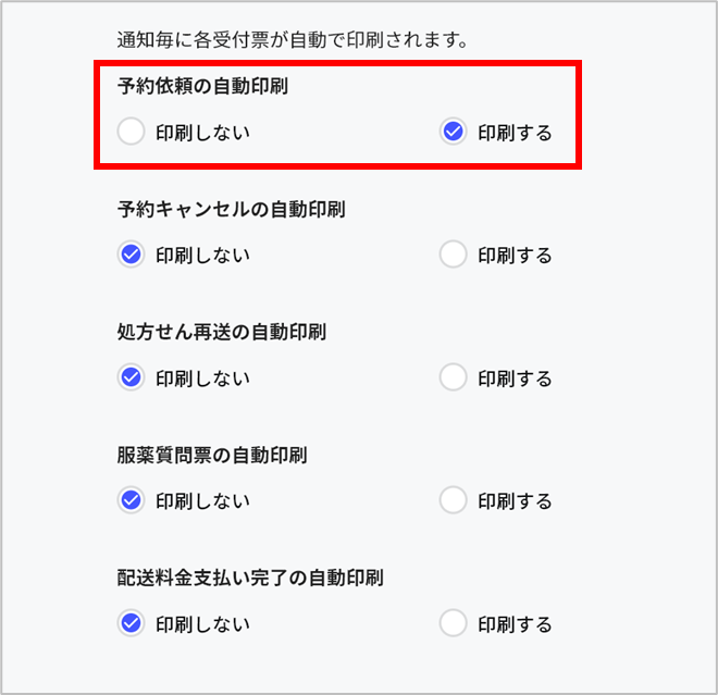 - 薬急便コンパネの設定画面にて、自動印刷の設定が「印刷する」になっているかご確認ください。
