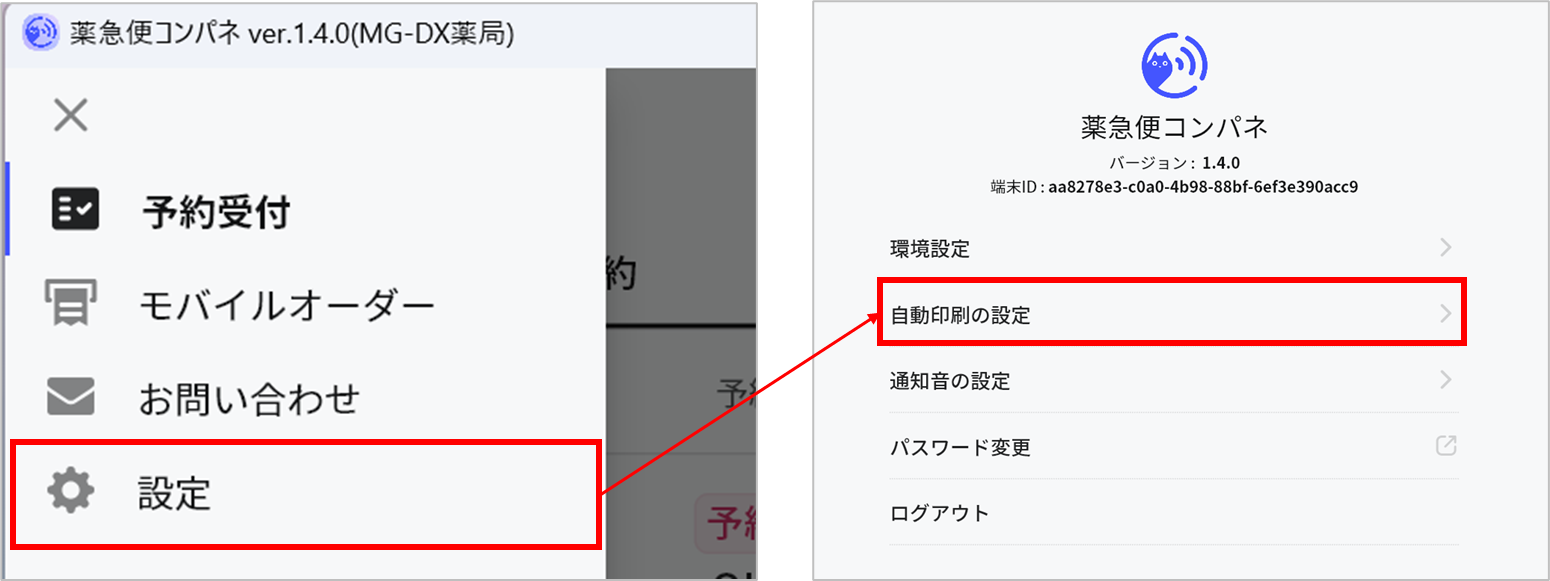 1. 薬急便コンパネを起動し、左上の「≡」>「設定」>「自動印刷の設定」を選択