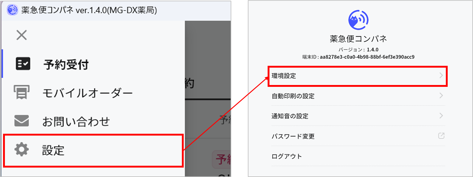 1. 薬急便コンパネを起動し、左上の「≡」>「設定」>「環境設定」を選択