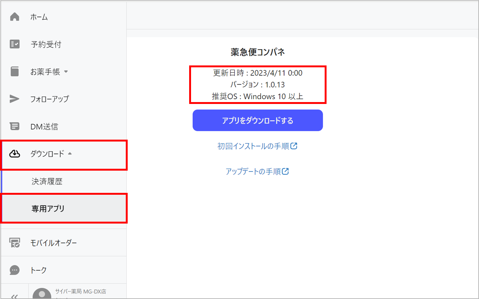 - 薬急便管理画面にログインし、画面左の「ダウンロード」>「専用アプリ」をクリック