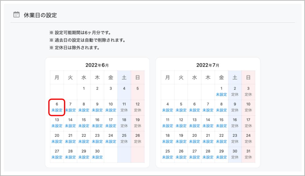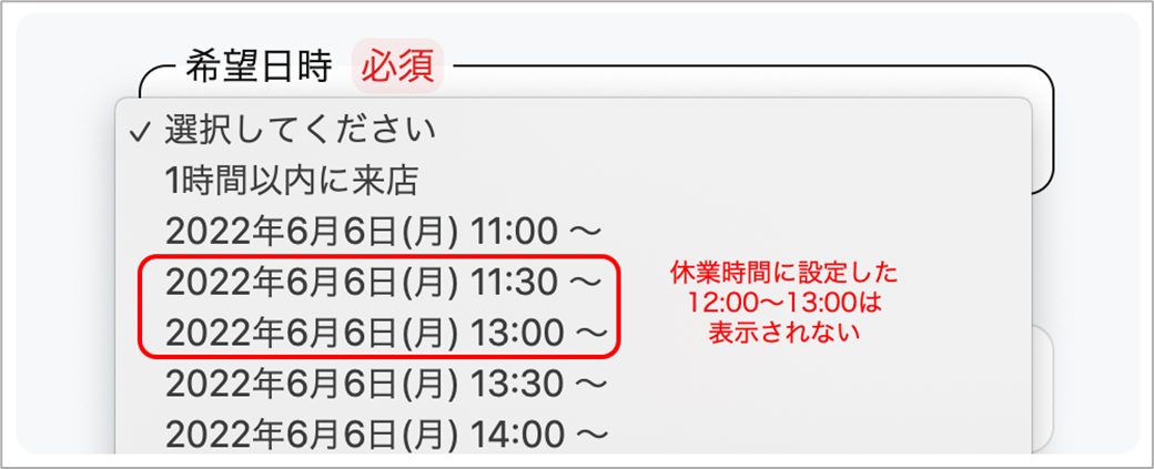 - 休業時間に設定した時間は、予約希望日時の選択肢に表示されなくなる。