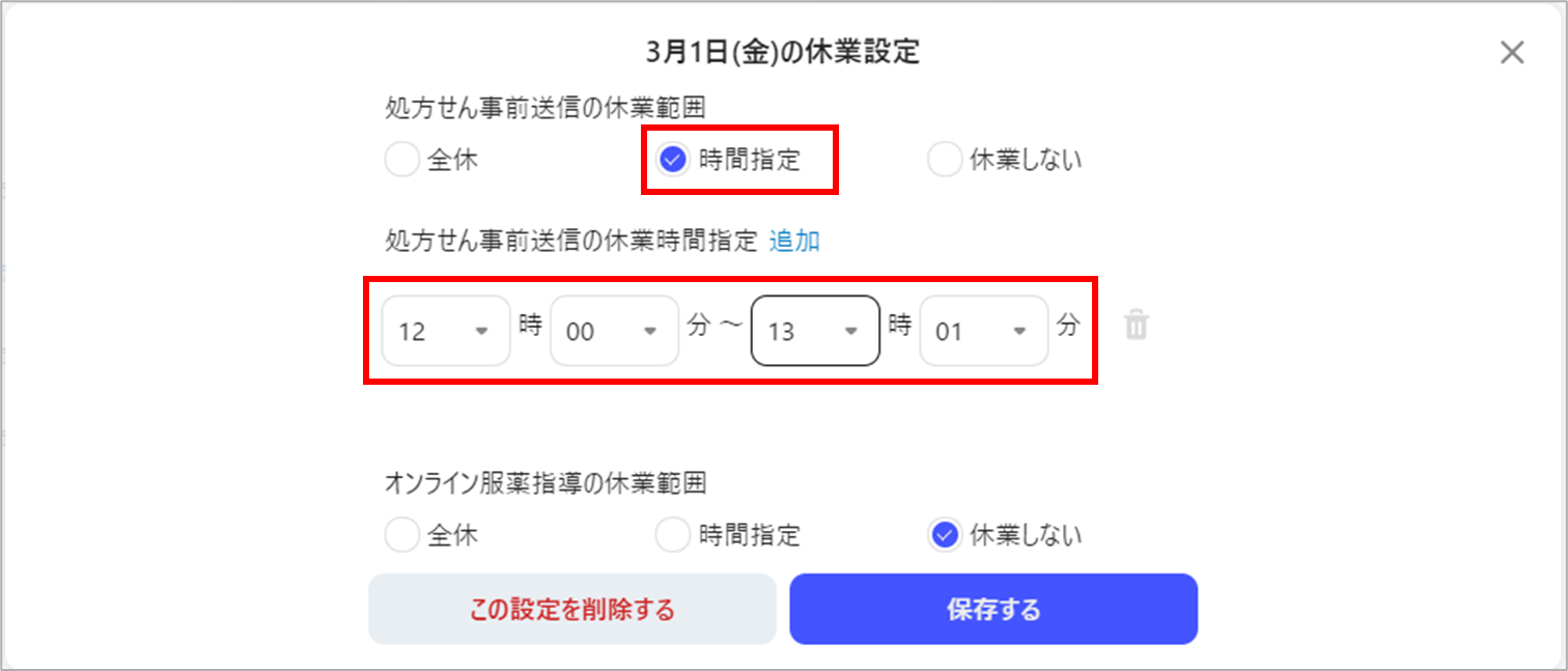 時間指定をした範囲が、調剤営業時間のうち休業指定され、患者さんが処方せん事前送信機能ご利用時に選択できなくなります。