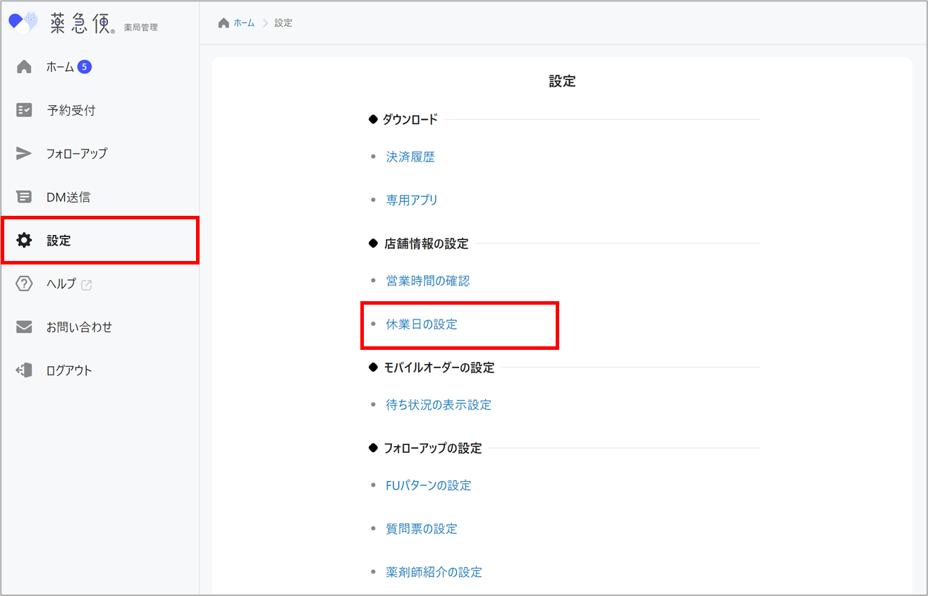 1. 薬急便管理画面左の「設定」>「休業日の設定」を選択