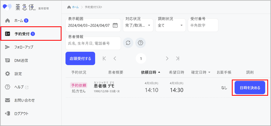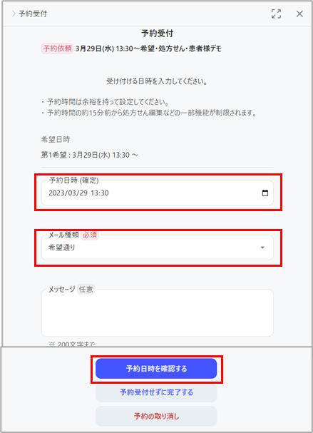 ※予約日時(確定)には、患者さん希望の日時が初期値で入っています。