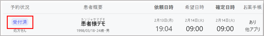 ↓ 予約が確定した患者さんは、予約状況が「受付済」に変わります。