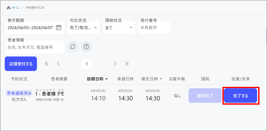 1. 調剤が完了した該当患者さんの「調剤完了」を選択