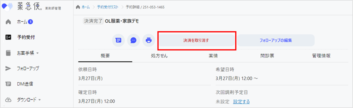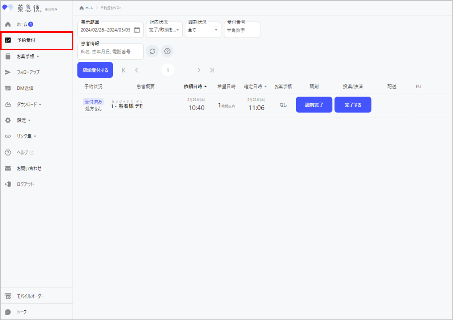 1. 薬急便管理画面左の「予約受付」の画面を開く