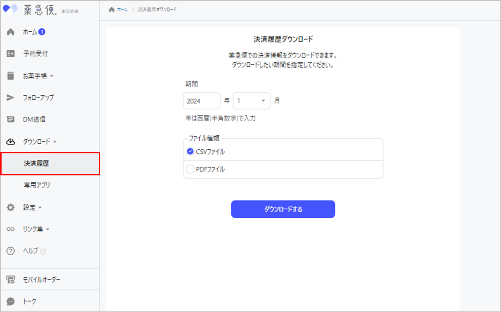 1. メニュー「ダウンロード」>「決済履歴」を選択