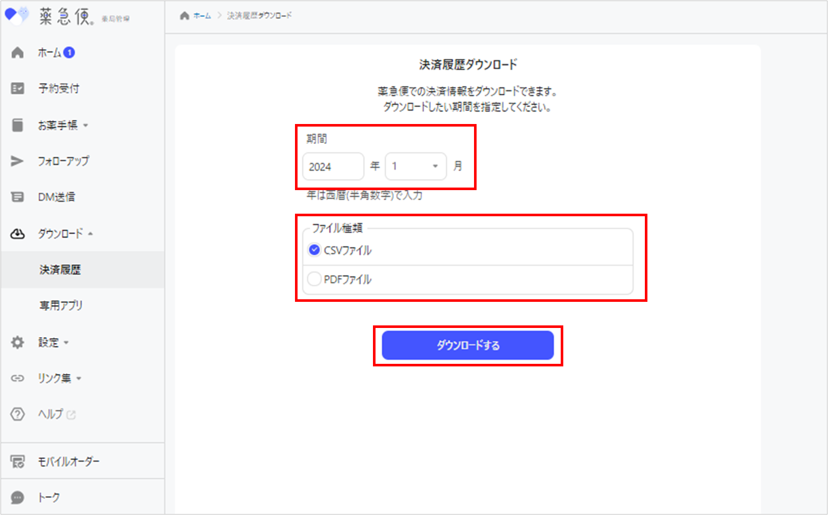 決済履歴ダウンロードの表示方法