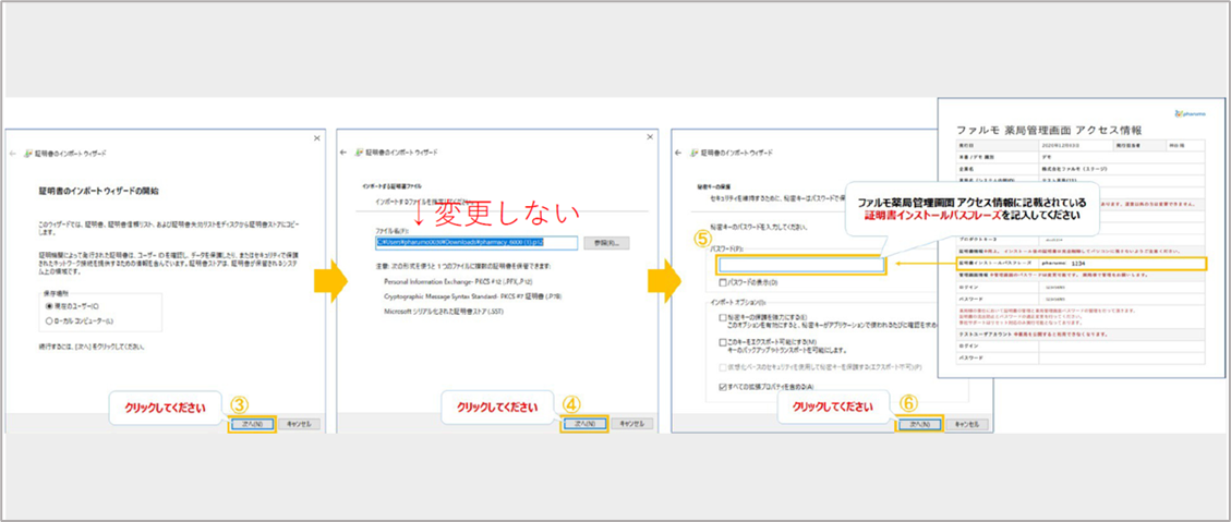 ⑤「ファルモ薬局管理画⾯ アクセス情報」に記載されている証明書インストールパスフレーズを記⼊⑥「次へ」をクリック