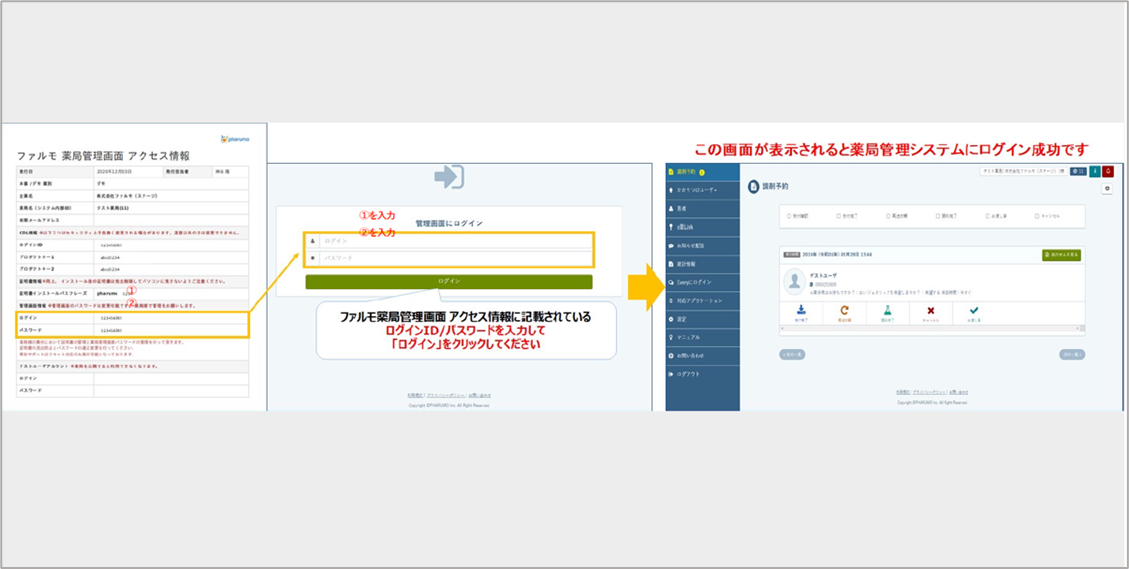 •「ファルモ 薬局管理画面 アクセス情報」に記載されているログインIDやプロダクトIDを⼊⼒