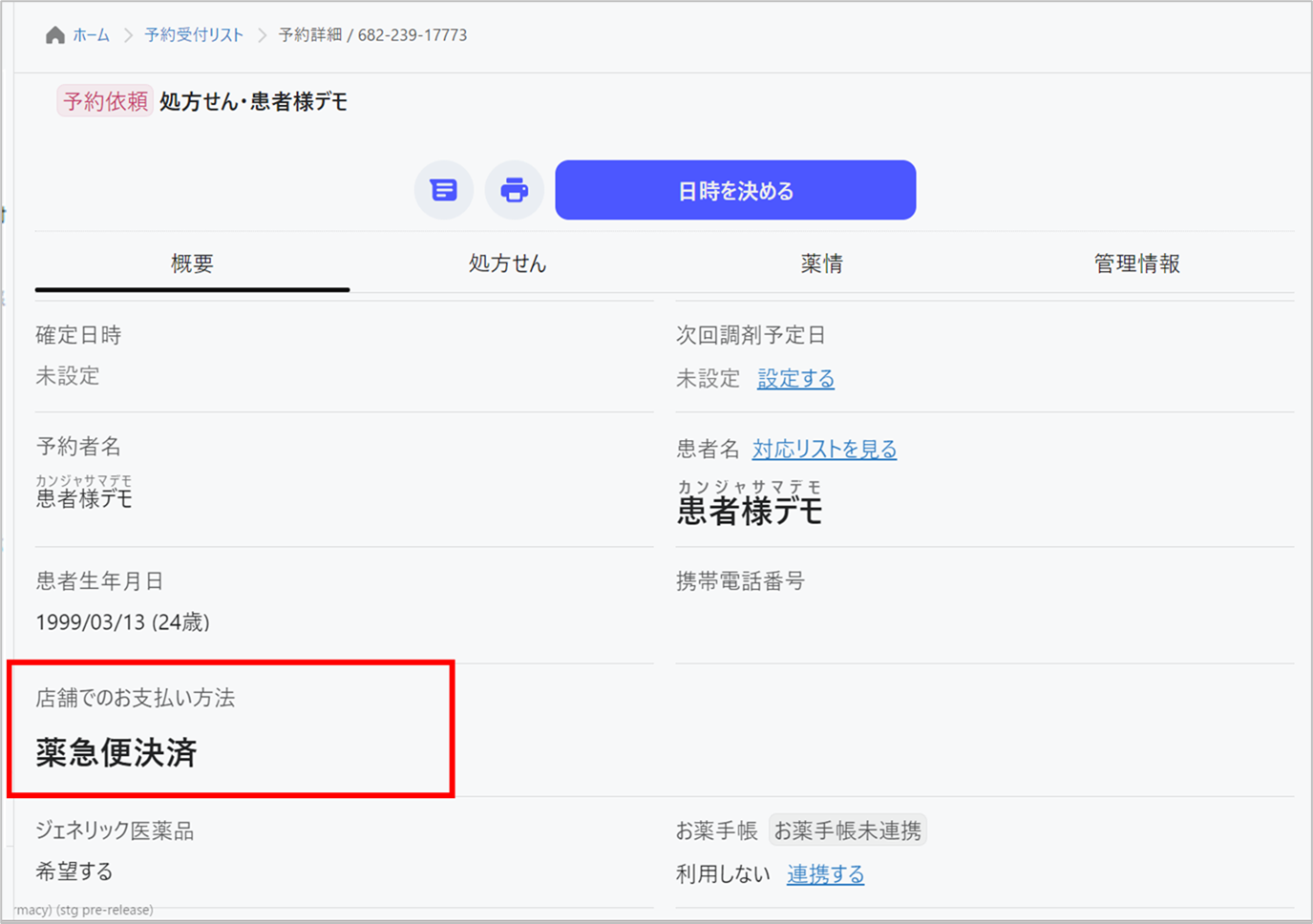予約時に薬急便決済を選択した患者さんは、薬局の予約詳細画面にて「店舗でのお支払い方法」が「薬急便決済」となります。