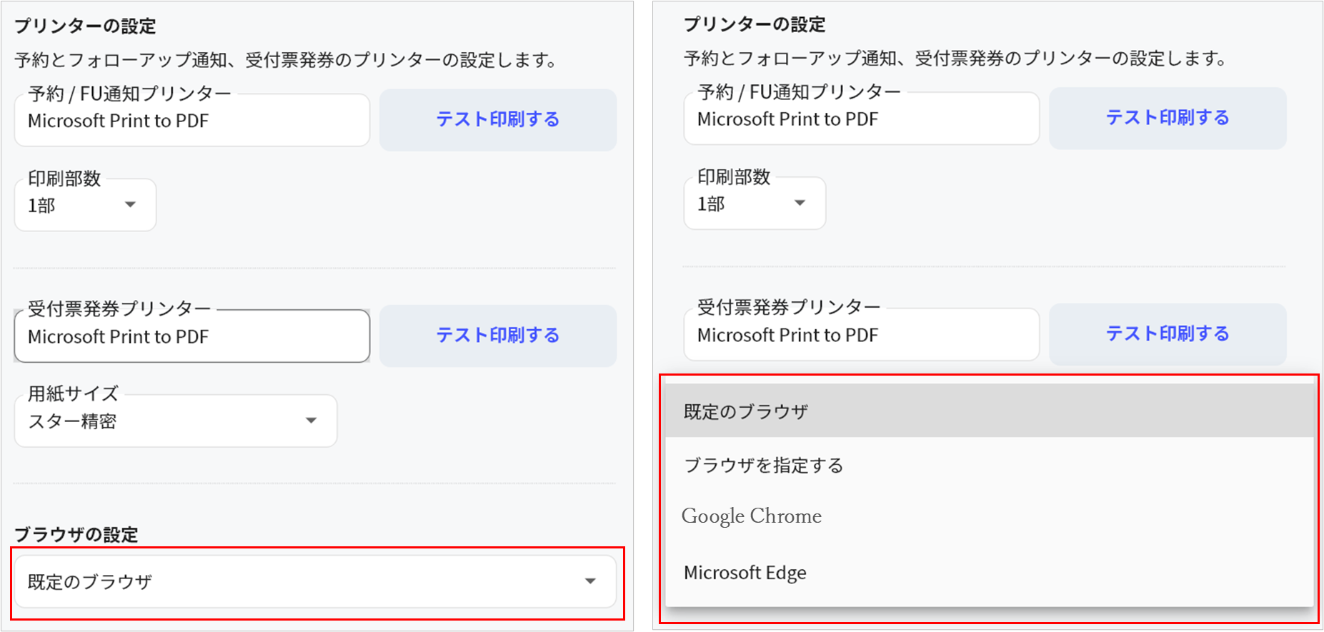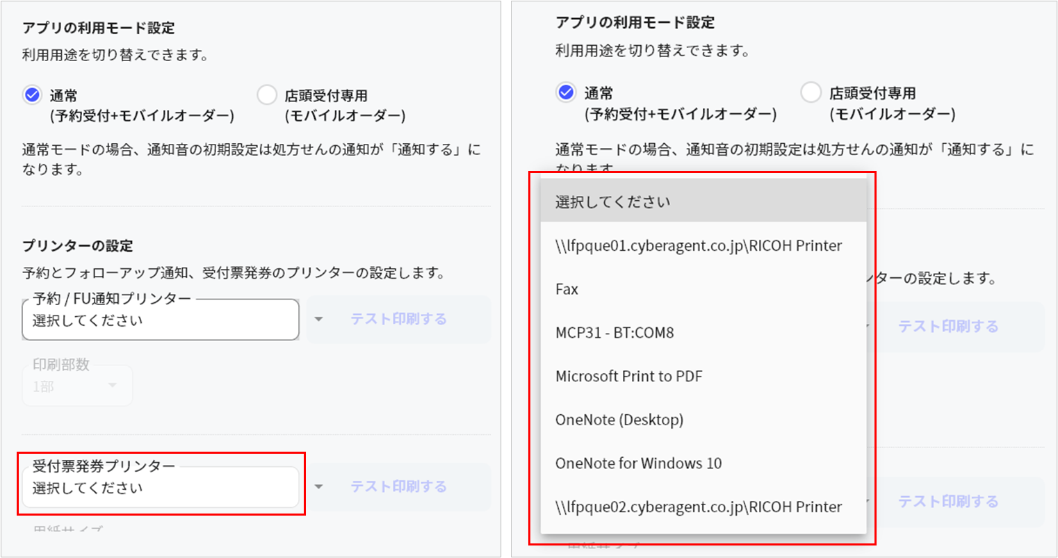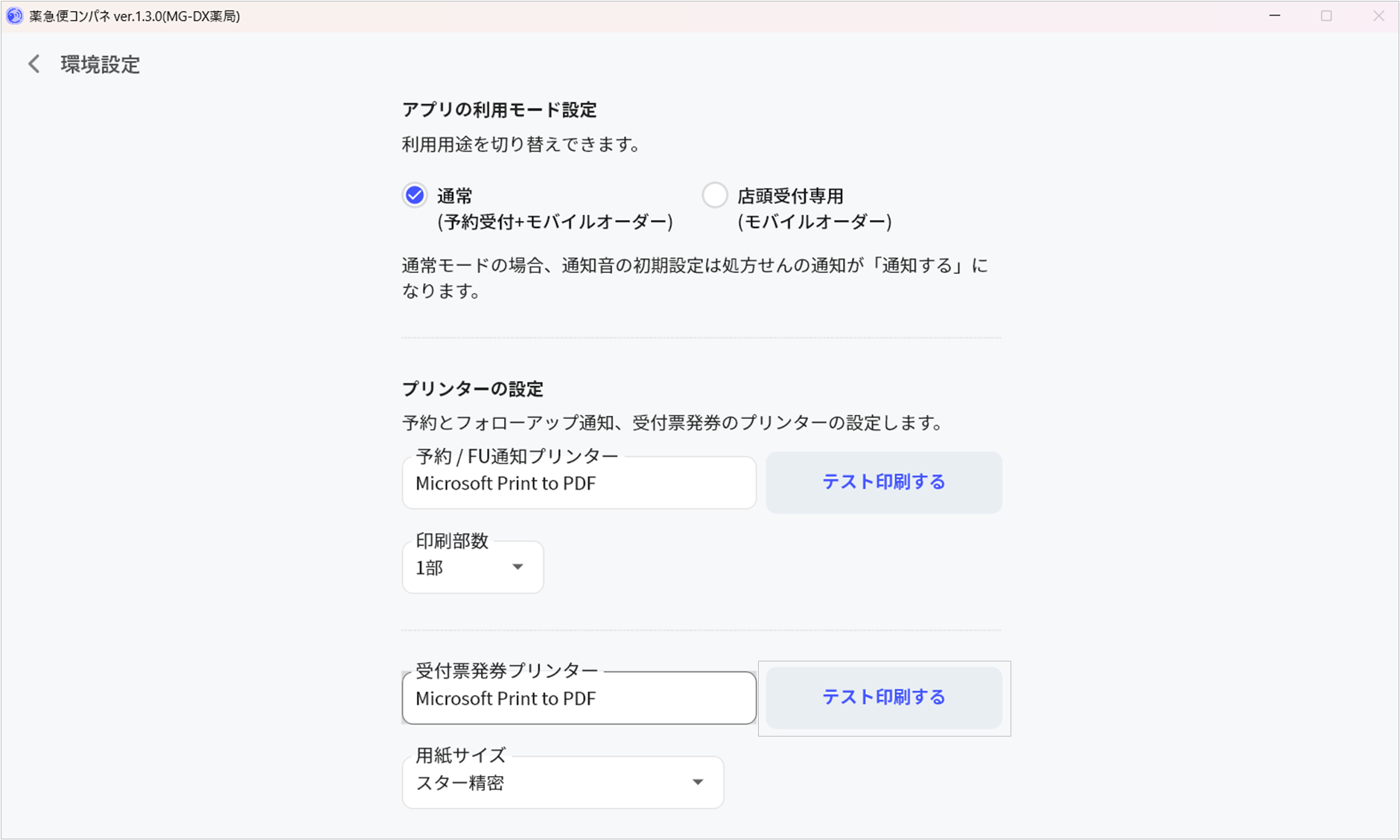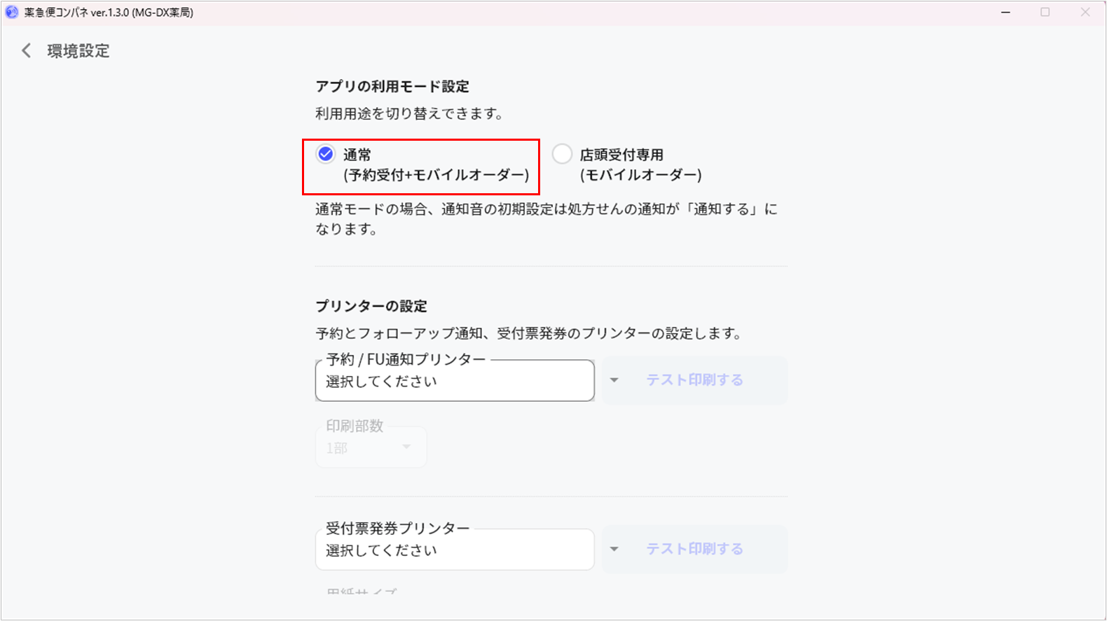 ※「店頭受付専用」を選択した場合、自動印刷や各種通知がご利用いただけなくなります。 - 「受付票発券プリンター」を選択