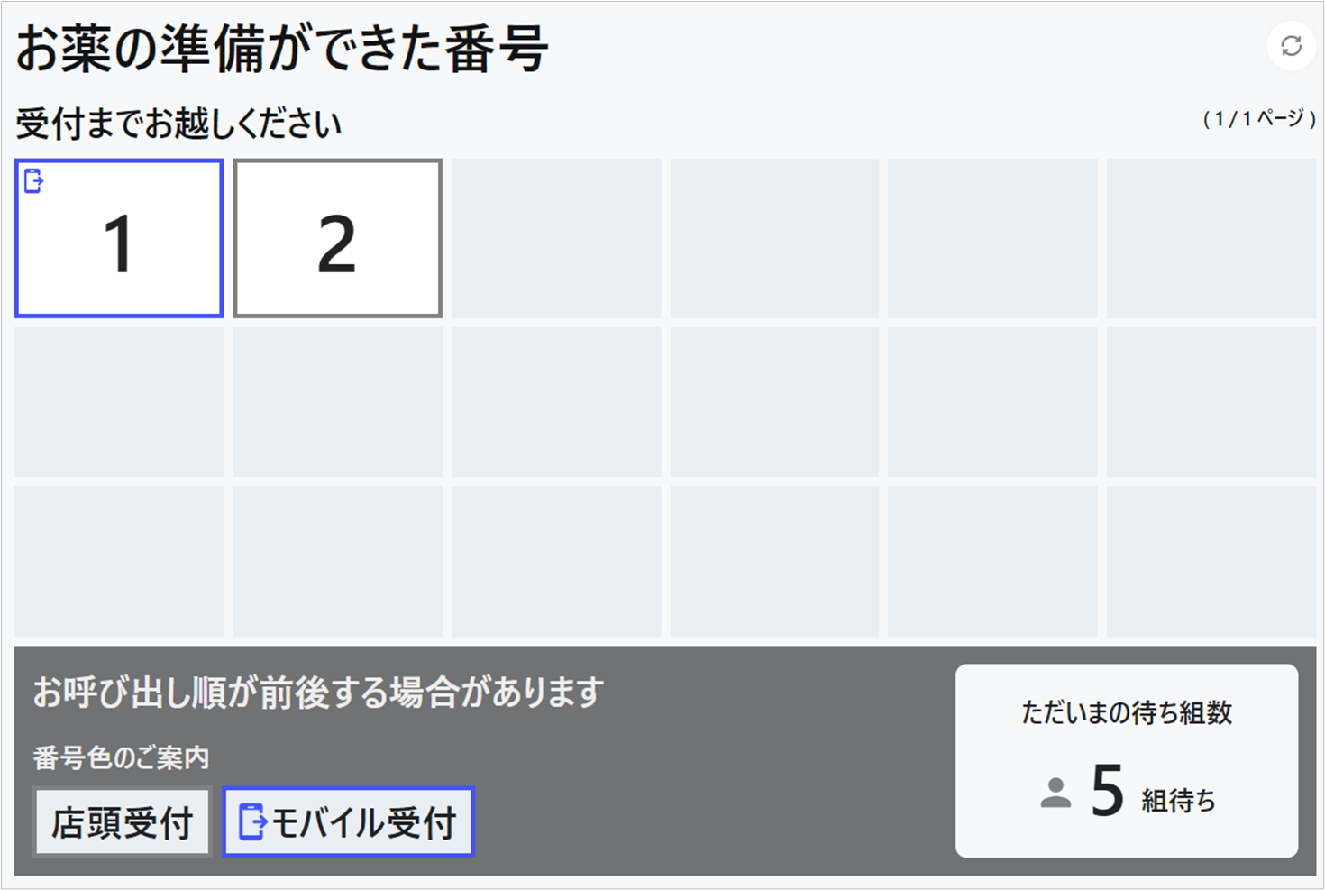 - 呼び出したい患者さんの番号を、店舗内のモニターや、患者さんのスマホ端末に表示ができます。