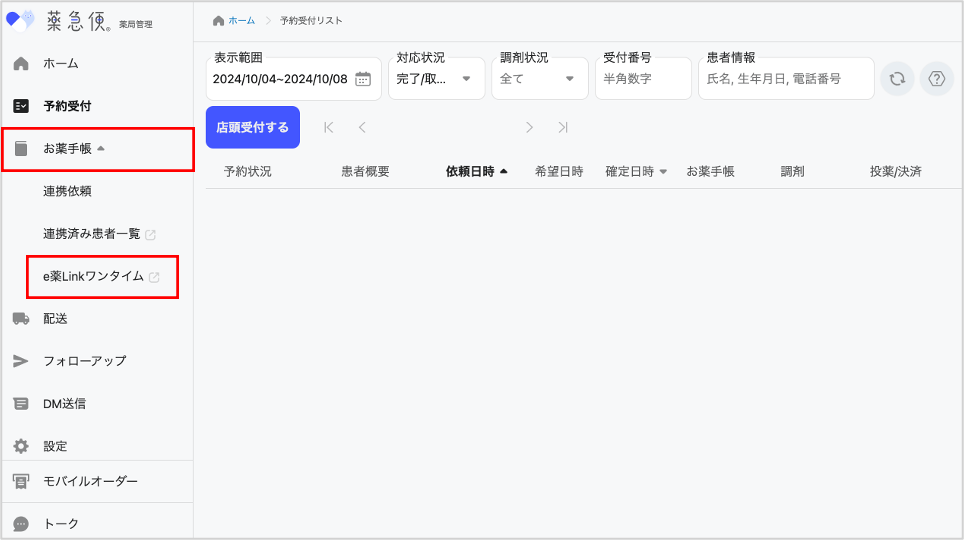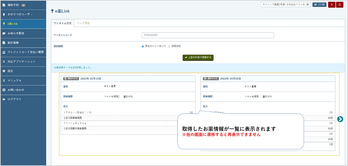 メニュー「お薬手帳」>「e薬Linkワンタイム」を選択