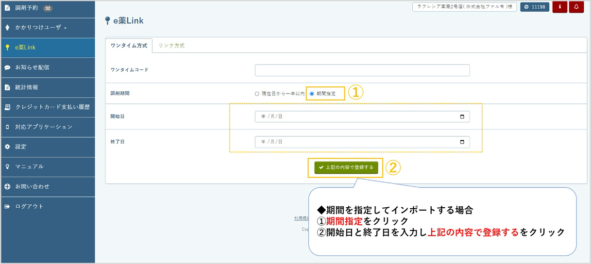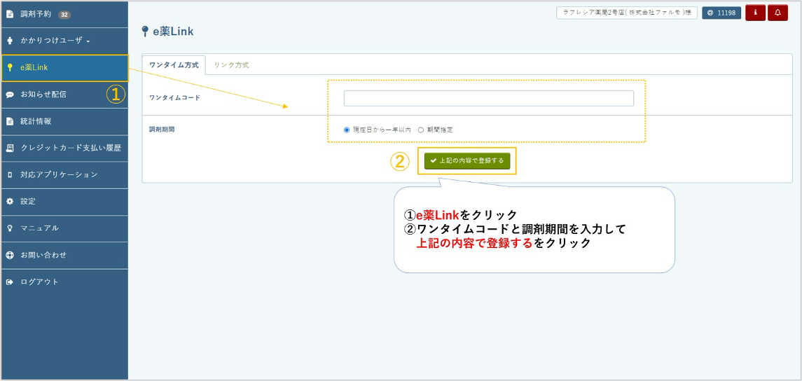 お薬手帳管理画面にて「e薬Link」を選択>ワンタイムコードと調剤期間を入力し、