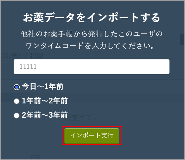 - 患者さんにご提示いただいたワンタイムコードを入力後、期間を選択し、「インポート実行」を選択