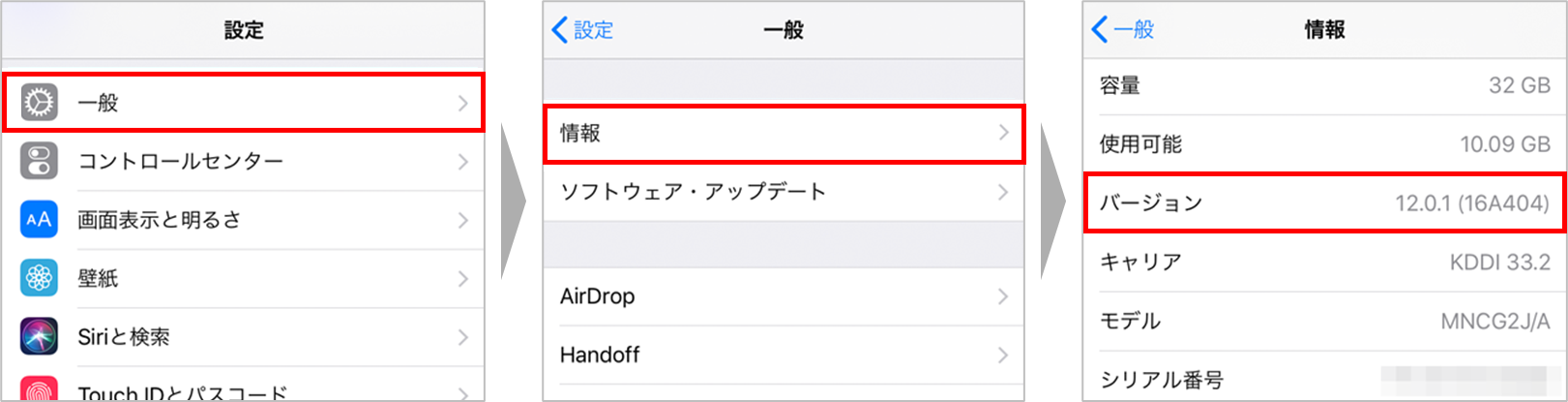ホーム画面「設定」>「一般」>「情報」でバージョンを確認