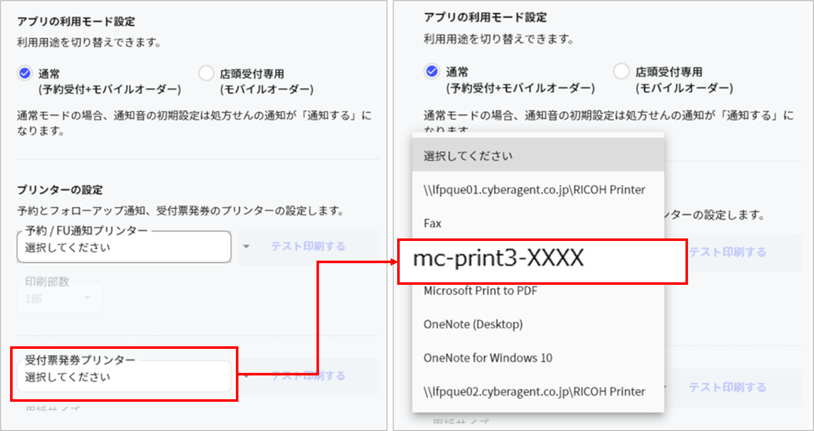 「受付票発券プリンター」でプリンターが正しく設定されているか確認